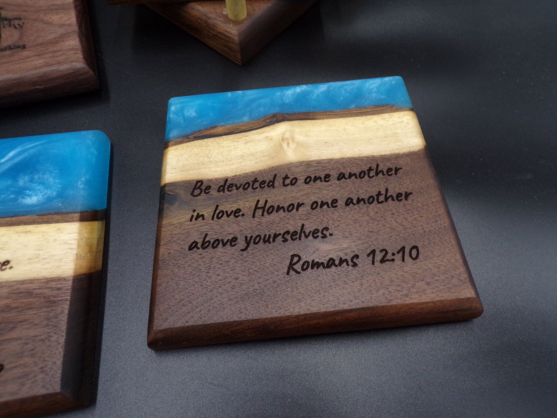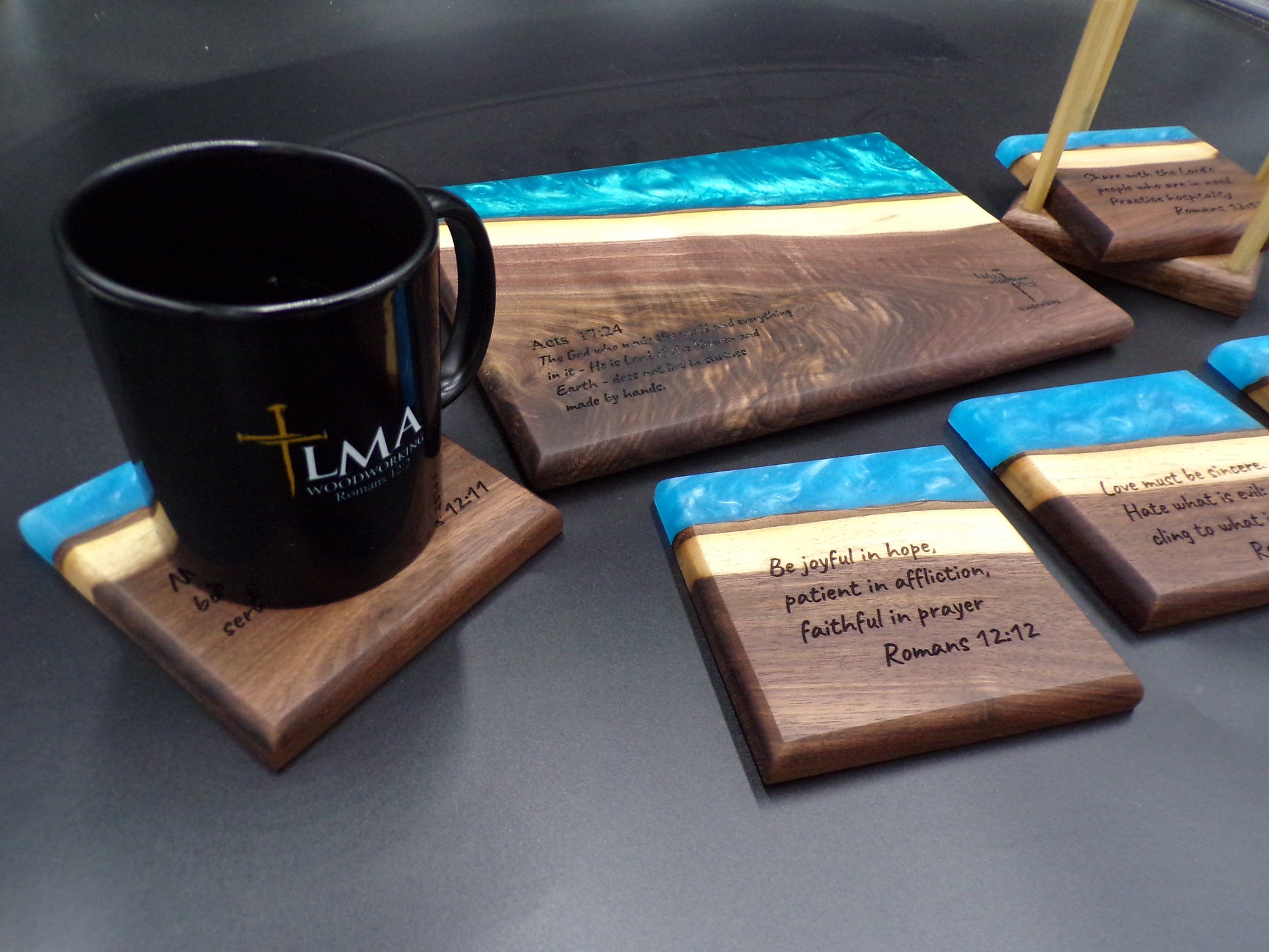 Personalized Walnut Epoxy Charcuterie Board and Coaster Set: God's Love, Faith and Transformation