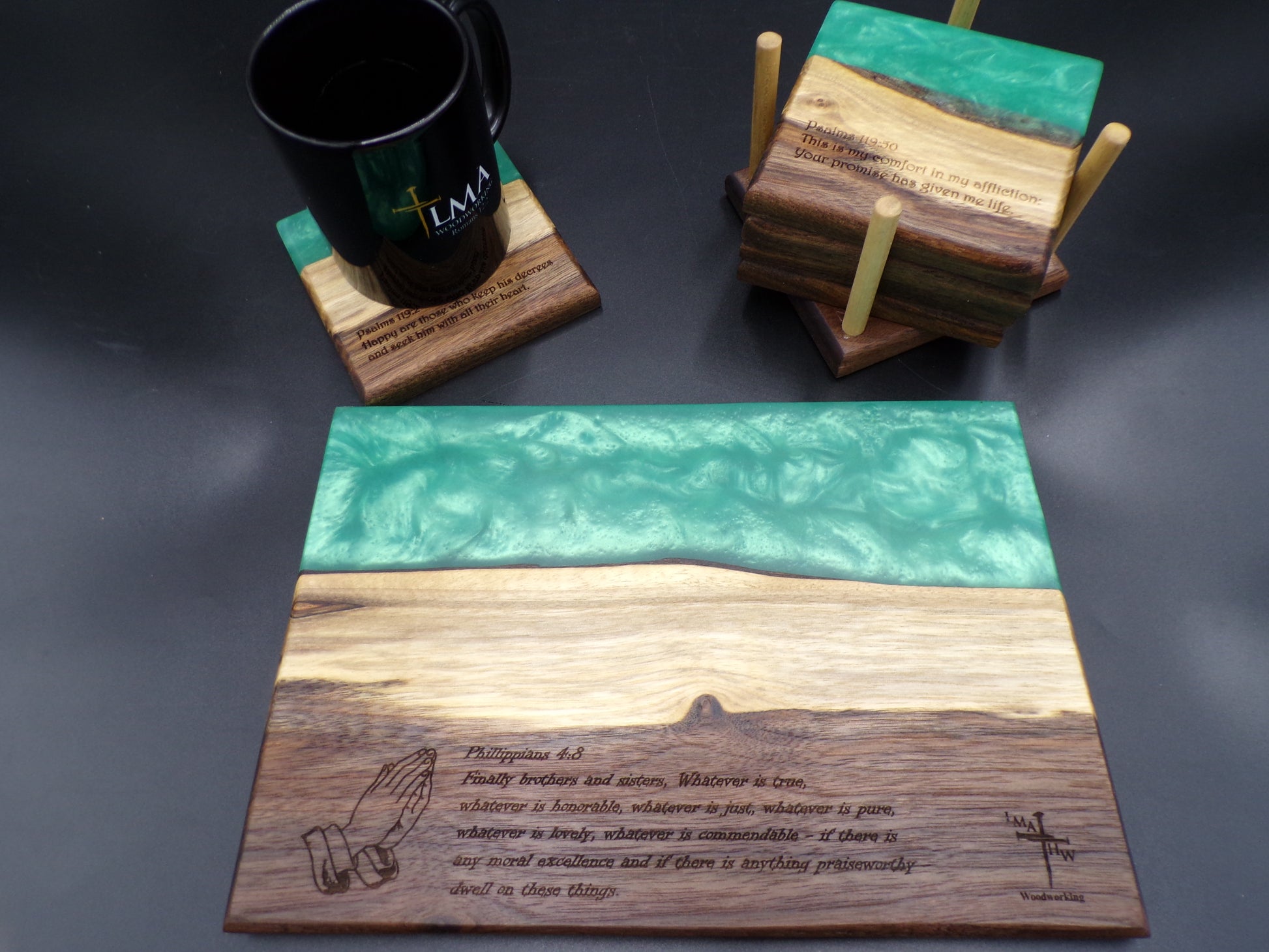 Elevate your culinary presentations, deepen your faith, and create lasting memories with our Personalized Bible Verse Live Edge Walnut Charcuterie Board and Coaster Set. Order yours today and bring a touch of divine inspiration to your home.