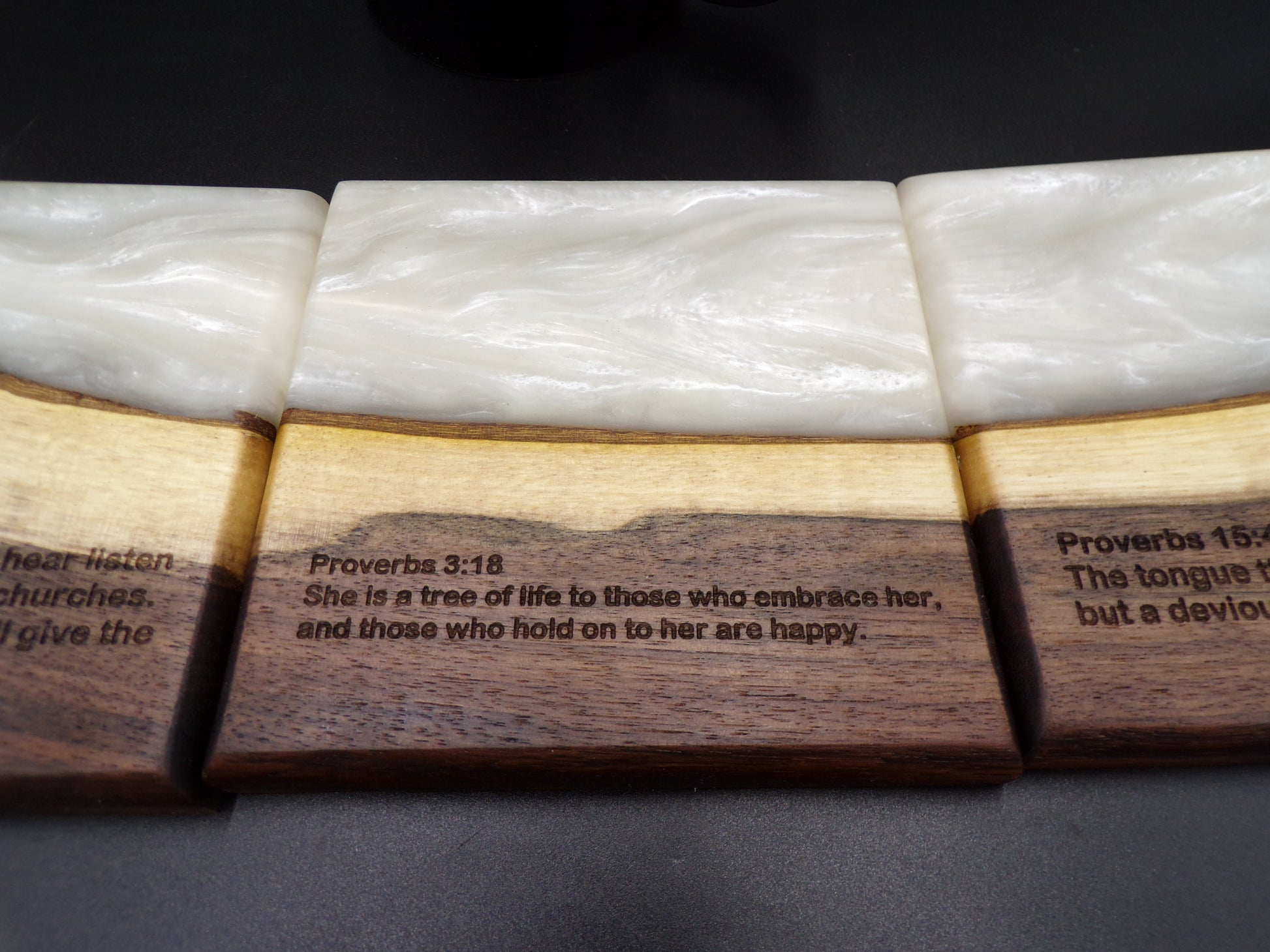 Elevate Your Faith and Entertaining Experience with Our Personalized Bible Verse Live Edge River Walnut Charcuterie Board and Coaster Set
