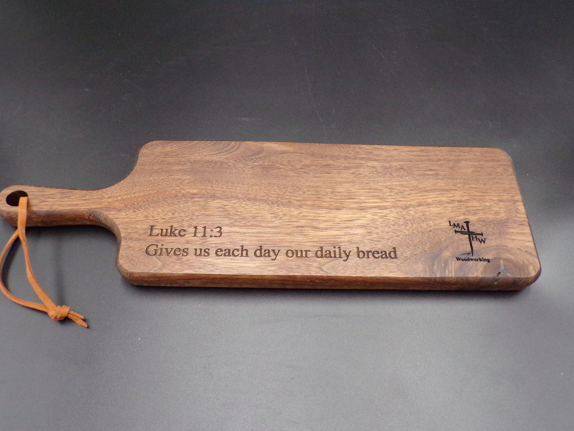 At LMA Woodworking, we don't just craft beautiful boards; we create timeless pieces that inspire and connect. Our "Personalized Bible Verse Walnut Paddle Charcuterie Bread Board with Leather Strap" is a testament to the union of faith, artistry, and the culinary world.