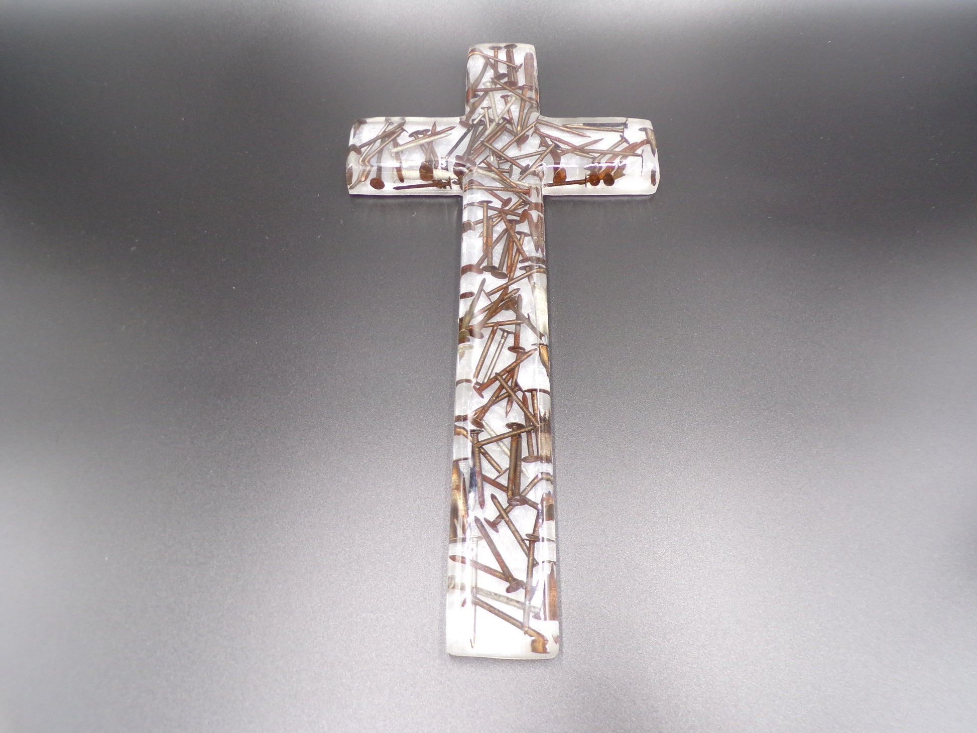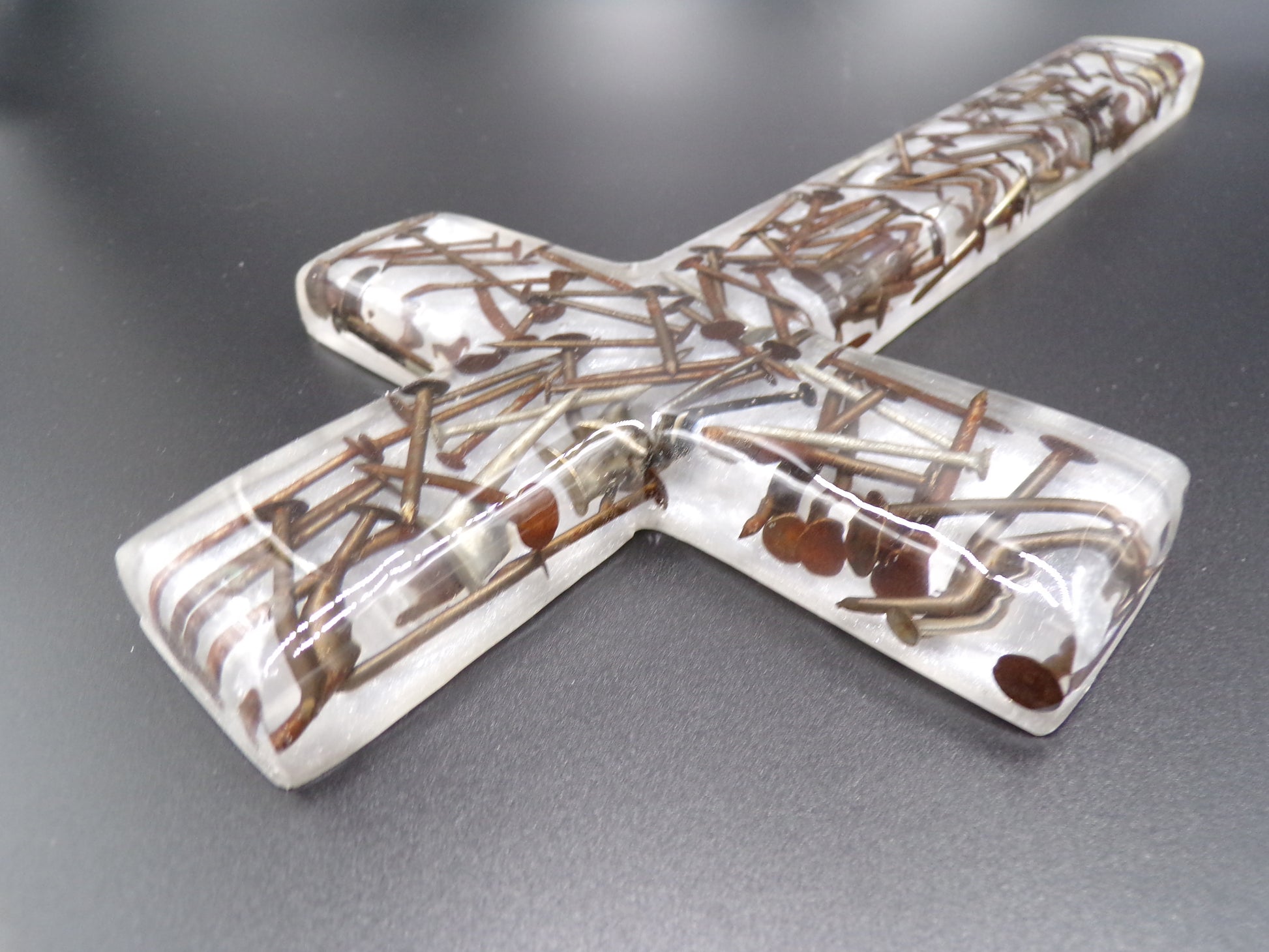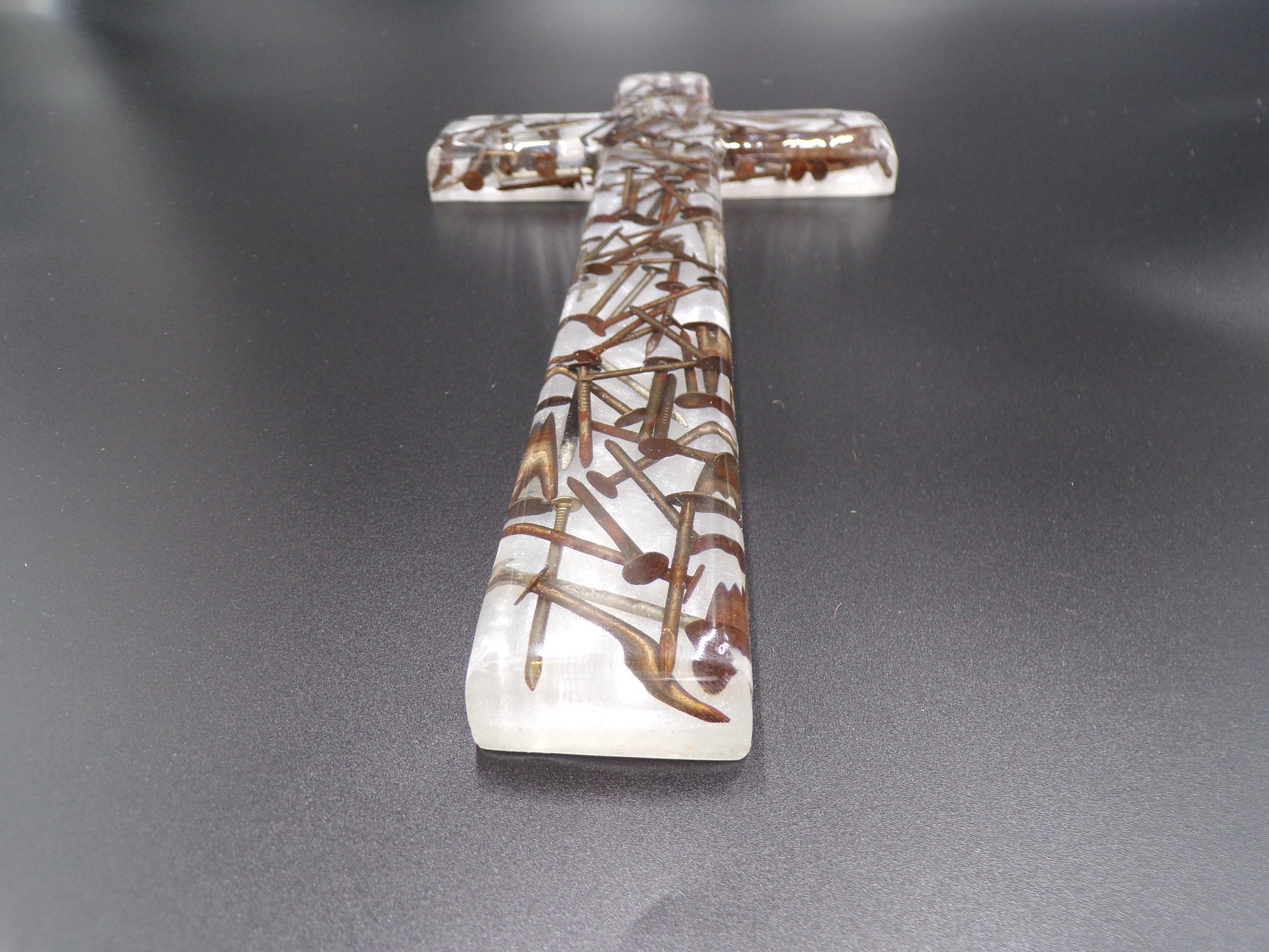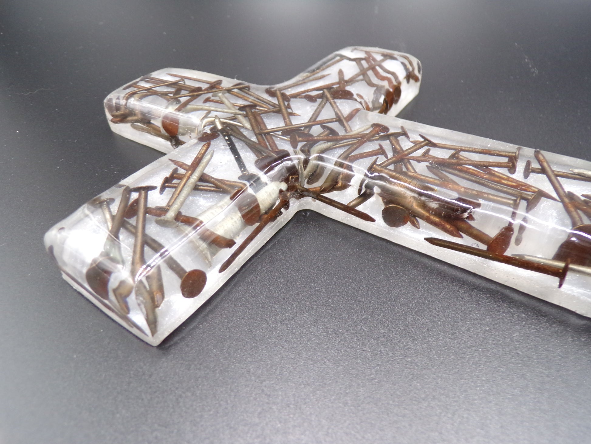 - This cross has a thin milky white background we laid the nails into the cross, then pour a clear resin epoxy over the nails. After the epoxy was set up we took the cross out of the mold, sanding it down to refinish it with an epoxy top coat to give that clear gloss shine.