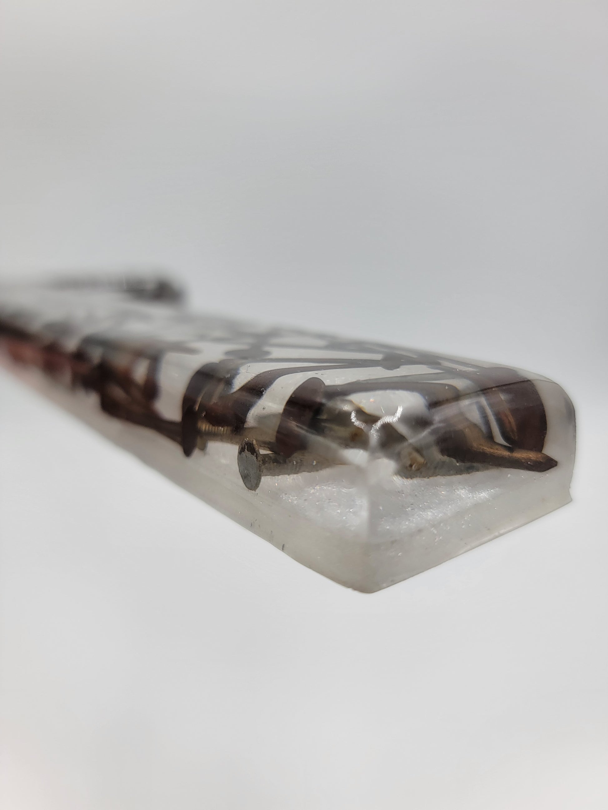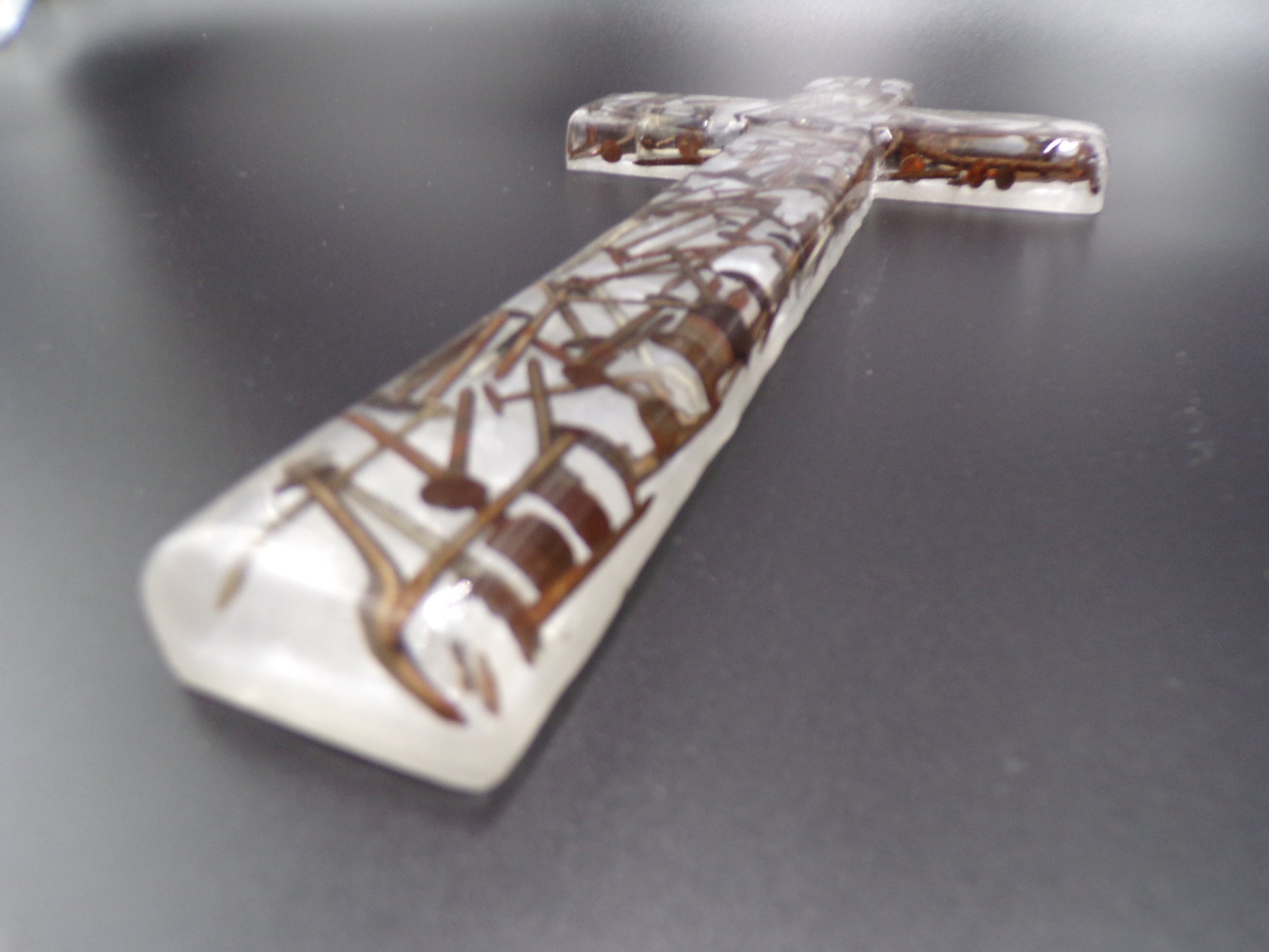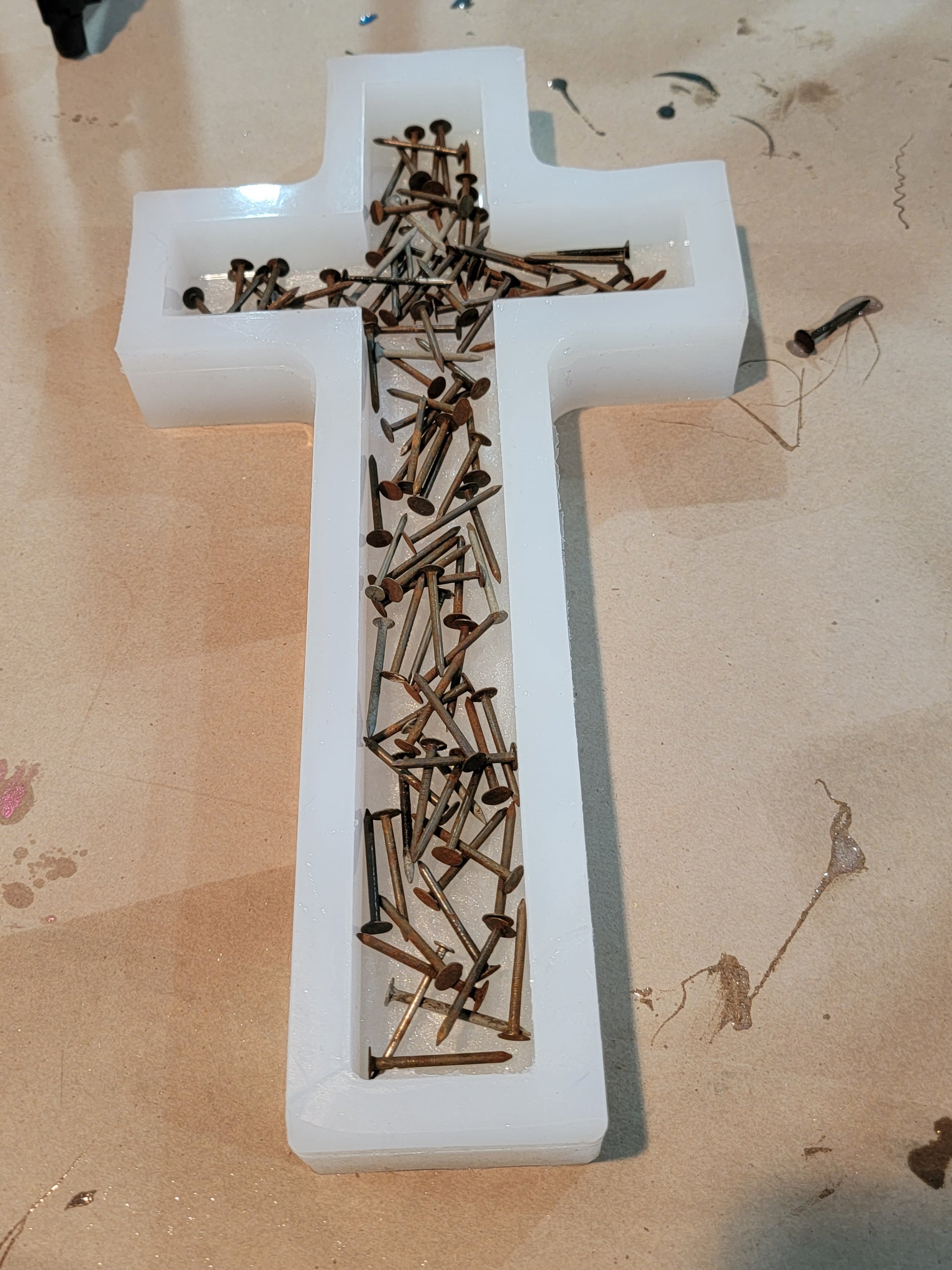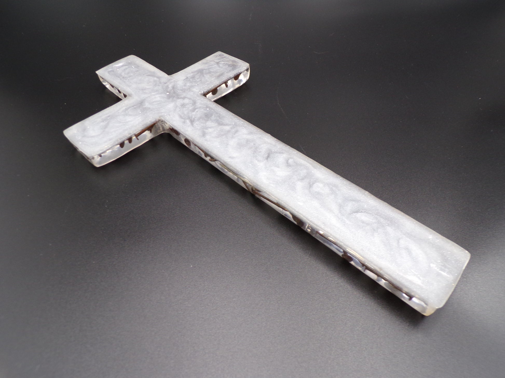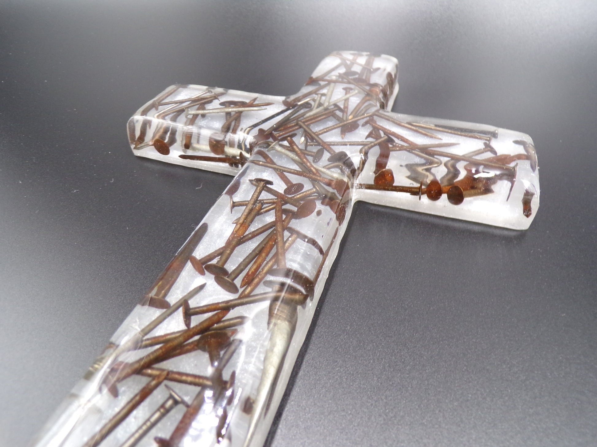 - This cross has a thin milky white background we laid the nails into the cross, then pour a clear resin epoxy over the nails. After the epoxy was set up we took the cross out of the mold, sanding it down to refinish it with an epoxy top coat to give that clear gloss shine.